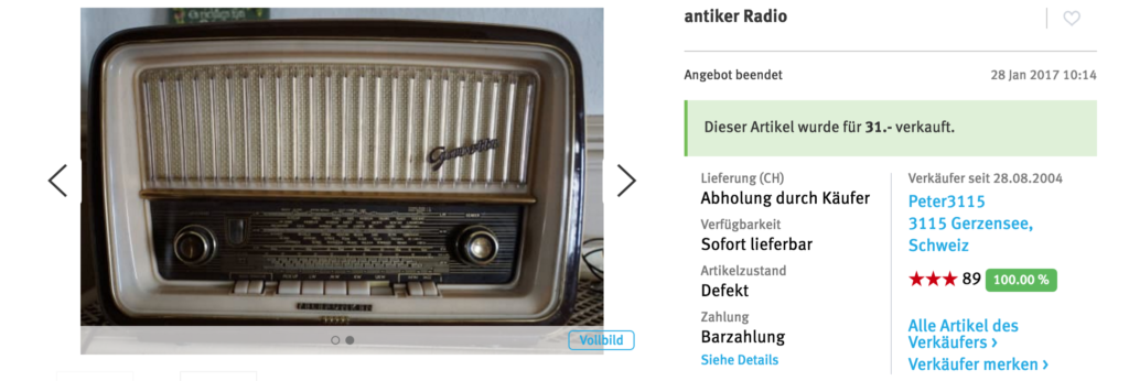 Ich hatte Glück und fand bei Ricardo einen schönen, uralten Radio den ich für 31.- ersteigerte.